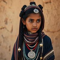 een berber meisje met authentieke blauwe kleding en sieraden en kralen in blauw zilver en rood op een licht bruine aarde muur achtergrond.