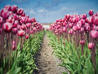 tussen de eindeloze rij met tulpen is een pad vrijgemaakt voor een tractorwiel, de bloemen zijn op ooghoogte van de bloemen gefotografeerd, meer op kop hoogte moet ik zeggen