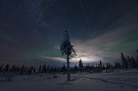een boom in de nacht. met een sterrenhemel. groene gloed in de lucht van het noorderlicht.