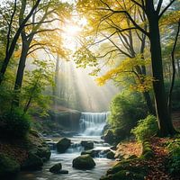 een bruisende waterval stromend in een beek met rotsen in het bos en groen geel bomen bos met licht inval stralen van de zon natuur landschap.