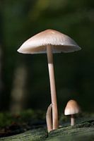 een grote en kleine paddenstoel in het bos met een donkergroene achtergrond