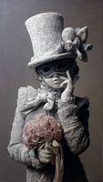 Gemaskerd en klaar voor het Ball Masque, Prima outfit voor een feest. De hoge hoed , de handschoenen , het masker , de strik en een prachtige jurk. Het zachtroze boeketje bloemen geeft net wat kleur aan deze print.