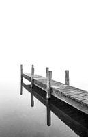 een mistige ochtend zorgt dat de aanlegsteiger alleen komt te staan in het landschap