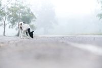 smorgens vroeg met opkomende mist is deze nieuwsgierige hond zijn territorium aan het bewaken langs de weg in Thailand