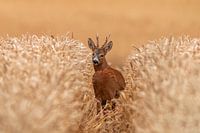 een reebok (Capreolus capreolus) staat in een tarweveld in een rijbaan