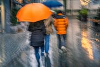 De kleuren zijn vrolijk, maar het is een sombere,regenachtige dag. De personen stappen stevig door . De reflecties zijn zichtbaar op de doornatte straat