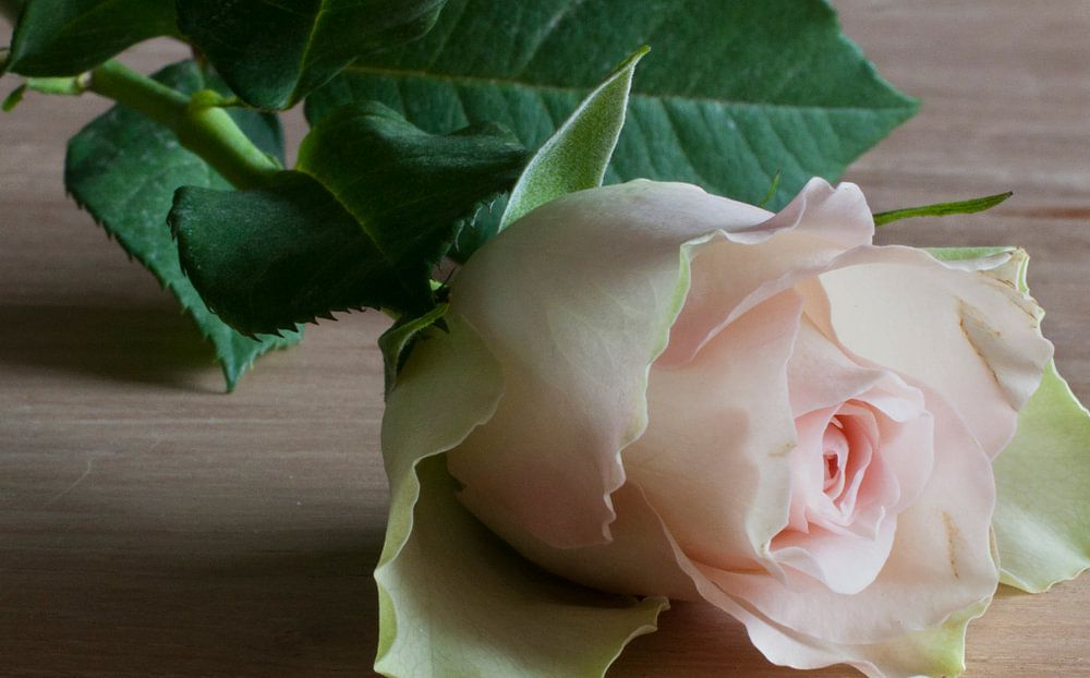 een roze roos op houten tafel