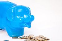 een plastic blauwe spaarvarken met euromunten om te sparen voor een appel voor de dorst