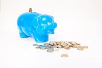 een plastic blauwe spaarvarken met euromunten om te sparen voor een appel voor de dorst
