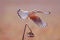 een vrouwelijke torenvalk (Falco tinnunculus) tijdens de vlucht opstijgend van een zonnebloem