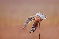 een vrouwelijke torenvalk (Falco tinnunculus) tijdens de vlucht opstijgend van een zonnebloem