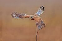 een vrouwelijke torenvalk (Falco tinnunculus) tijdens de vlucht opstijgend van een zonnebloem