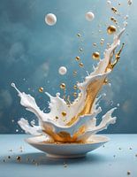 Een witte kom op blauwe achtergrond met opspattende witte verf vloeistof melk en goud kleur met ronde witte bolletjes in de lucht en goud bolletjes rondom verspreid over de grond.