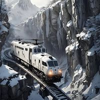 een witte trein rijdt door een besneeuwde kloof, steampunk