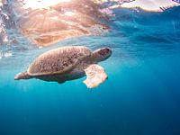 Deze zeeschildpad zwemt rustig in de warme Egyptische zon