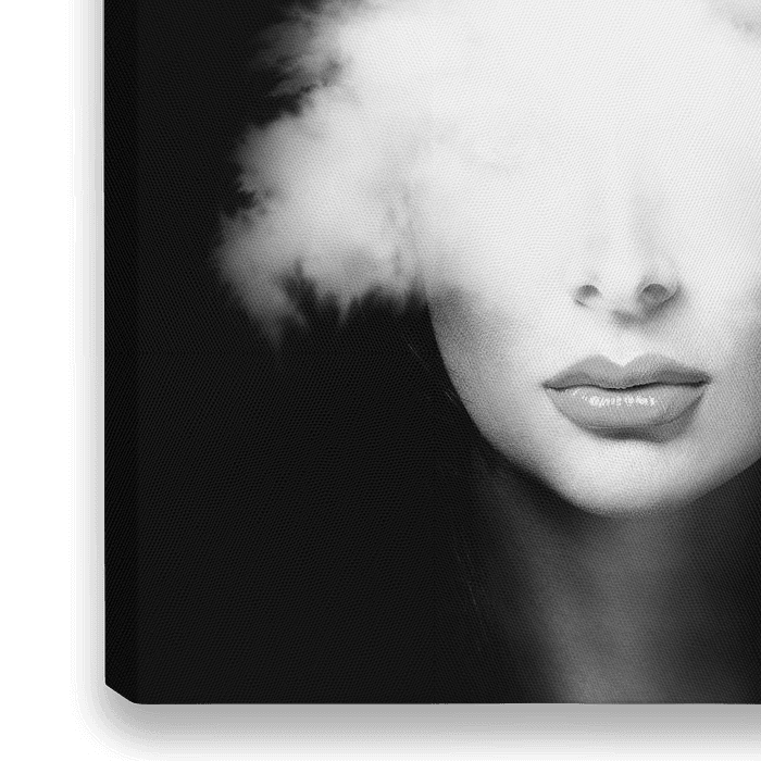 Koop dit zwart-wit kunstwerk een zwart-wit portret van een vrouw met een witte wolk of mist die haar ogen bedekt. van Dreamy Faces op canvas, aluminium dibond, (ingelijste) fotoprint, behang en ArtFrame, op maat geprint in Fine-Art kwaliteit.