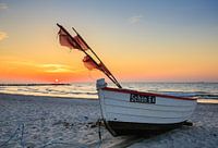 eenzame kleine vissersboot in de zonsondergang op de Oostzee.