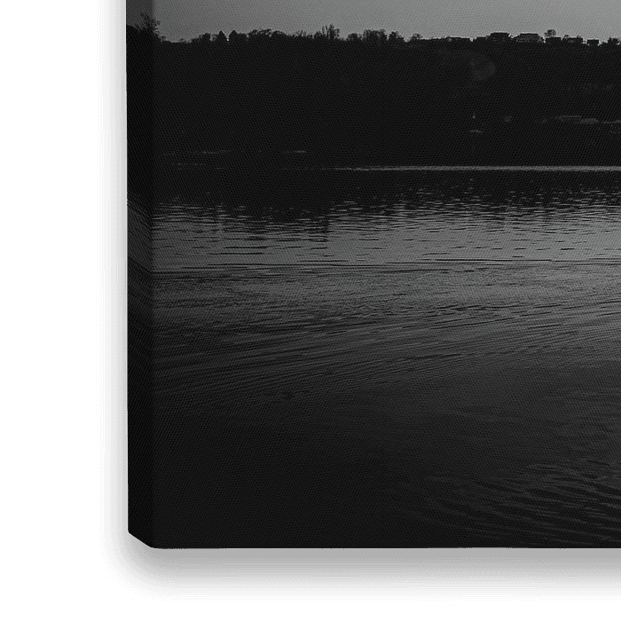 Koop dit landschapskunstwerk eenzame man peddelend op Baldeneysee bij zonsondergang in zwart-wit van Dieter Walther op canvas, aluminium dibond, (ingelijste) fotoprint, behang en ArtFrame, op maat geprint in Fine-Art kwaliteit.
