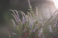 close up van een heideplantje, helemaal aan het begin van de bloei, in de zomer, met een zachte bewerking