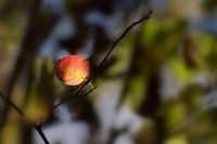 eerste rode herfstblad in het donkere bos, seizoensgebonden natuur achtergrond met kopieerruimte, geselecteerde focus, smalle scherptediepte