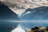 reflectie van de bergen in het fjord eidfjord in noorwegen