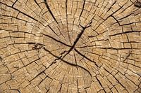 Barsten in omgezaagde restant van eik met duidelijke jaarringen