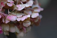 macro opname van een roze hortensia die op het einde van zijn bloeitijd is en die hangende bloemblaadjes heeft, dit met een donkere achtergrond