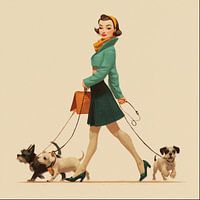 we zien een elegante dame op hoge hakken, met haar drie hondjes onderweg.