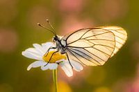 Een boomwitte vlinder zit in het tegenlicht op een madeliefje. Zonlicht valt door zijn vleugels en laat hem eruit zien als een elf.