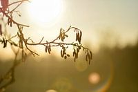 close up van een tak met elzenkatjes met op de achtergrond de opkomende zon