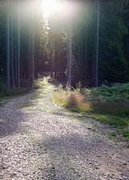This photo was taken at late afternoon in the south of sweden. Beams of sunlight shine on a stoney roads that leads into the endless swedish woods.