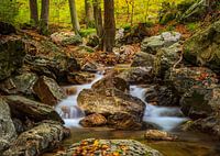 Landschapsfoto van een leuk riviertje langsheen de rotsen in de herfstbossen van Spa (België)