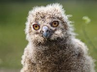 Jonge Europese Oehoe, ongeveer 4 tot 6 weken oud. De oehoe (Bubo bubo) is een van de grootste uilen ter wereld, en vermoedelijk de op een na grootste uilensoort na de Blakistons visuil.