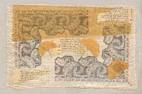 collage van decoratieve motieven afgedrukt op deli paper, op stof geplakt met vloeipapier er overheen, met ginkgo blaadjes en fragmenten uit Grieks schoolboekje