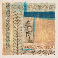 collage op stof met gouddraad van prints op deli paper en gekleurd vloeipapier
