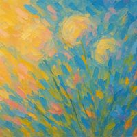 Losse penseelstreken in frisse kleuren suggereren een weide vol paardenbloemen...