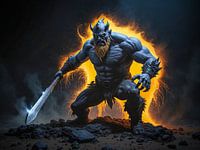 Een afbeelding van een fantasie kunstwerk gespierde man met zwaard en brandende aura