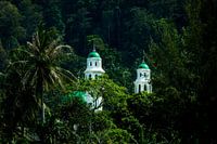 Een moskee in Palau Weh Sumatra. Het lijkt wel een fata morgana omringt door palmbomen. De groene koepels en het wit van de moskee steken mooi af. Asian fairytale, aladdin in the jungle of Indonesia.