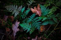 Prachtige bladeren samen met varens op de donkere bosgrond. Een groot contrast waardoor er een moody sfeer ontstaat. Ook het contrast qua kleur is groot, groene bladeren met bruine donkere bladeren.