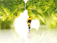miniatuurtje van een wielrenner op de fiets in de gele trui fiets door een groen bos van broccoli