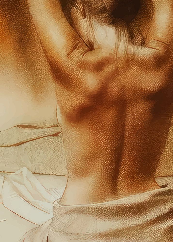 een persoon die met zijn rug naar de kijker zit, de armen boven zijn hoofd geheven in een sierlijke pose. Blijkbaar was hij vanaf zijn middel gedeeltelijk in doeken gewikkeld. De rug en armen van de figuur zijn ontbloot, wat een gevoel van kwetsbaarheid en elegantie creëert.