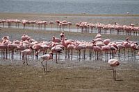 Aan de kust van Namibië vindt je een grote variëteit van wildleven. Zoals de Flamingo's bij Walvisbaai. Vlak bij de stad lopen ze gewoon in de baai.