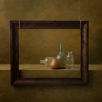 Een sfeervol stilleven met een paar oude flesjes en een peer.