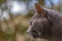 close up van de kop van een kat, die ergens gefocust naar zit te kijken, met een doffe groene achtergrond