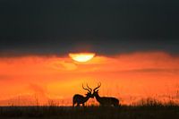 Twee gazelles tijdens een van de mooiste zonsondergangen op de afrikaanse savanne in Kenia in Afrika. Een fraaie oranje gloed op de achtergrond, terwijl de opkomende zon nog net onder het lage wolkendek nog zichtbaar is. Een iconisch beeld dat ik me nog lang zal heugen.