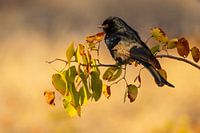 Een rouw drongo zit op een tak van een mopanestruik. Het warme ochtendlicht roept een geweldige, kalme sfeer op. Genomen in het Kruger National Park, Zuid-Afrika.