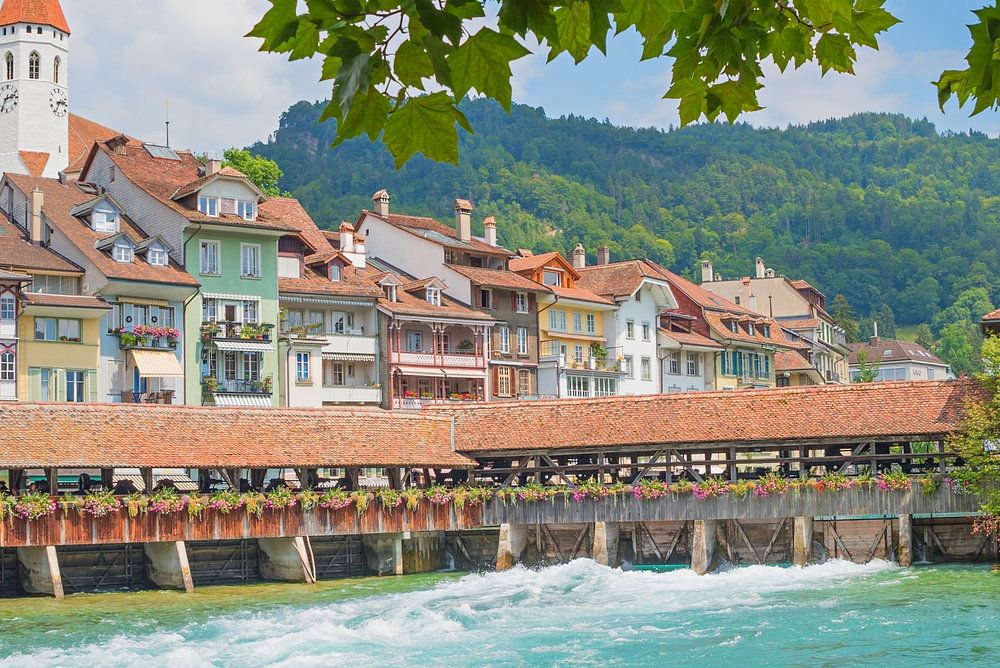 foto historische oude stad toeristenoord thun en houten dam brug over aare rivier, zwitserland. takken met groene esdoorn bladeren