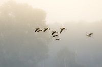 Gak gak gak, eerst hoor je het geluid en dan verschijnt er een klein groepje ganzen uit de mist. Van vaag naar steeds duidelijker zichtbaar, de opkomende zon en de mist dragen echt bij tot de sfeer op deze heerlijke herfstochtend in het weerterbos.