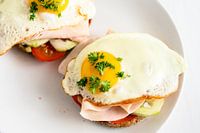 gebakken ei op volkorenbroodje met tomaat, komkommer en gekookte ham, gezond stevig ontbijt op een witte tafel, kopieerruimte, hoge hoek uitzicht van bovenaf, geselecteerde focus