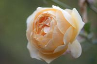 close up van een prachtige roos, met een geel oranje kleur, en een donkergroene achtergrond